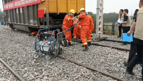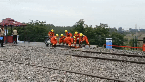 比赛开始,救援小组按照既定分工,抬着起复设备迅速进入预设事故现场,按照预设方案,依次开展安全防护、脱轨车辆调查、设置车辆防溜等准备工作,争分夺秒安装救援设备、顶起车辆、平移复位,耗时11分10秒,脱轨车辆在起复机作用下缓慢回落到钢轨轨面。